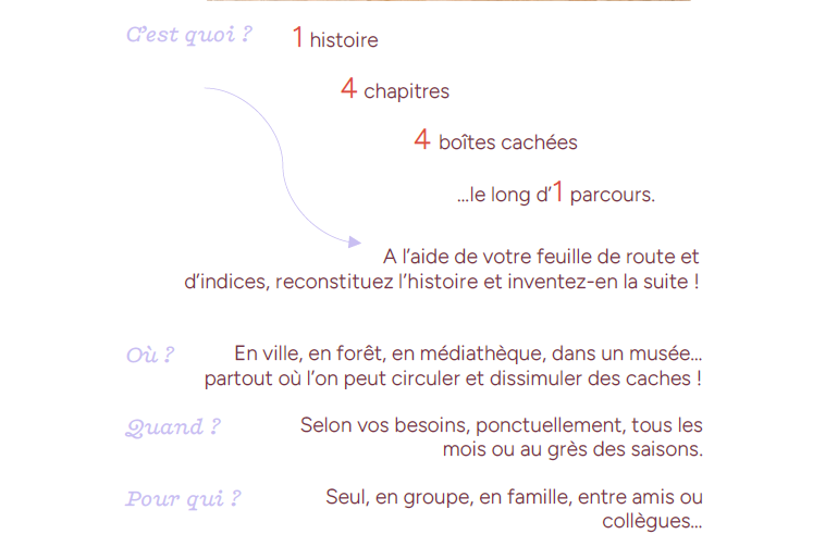 Nous nous sommes inspirées du Géocaching et de la créativité de sa communauté pour imaginer ces itinéraires littéraires dans l’espace public et re-créer du lien par la lecture et l’écriture.