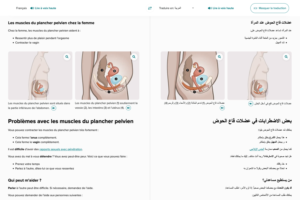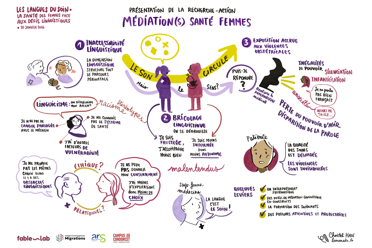 Nous avions sélectionné dès 2022, les outils gratuits et complémentaires pouvant être utilisés au quotidien par des femmes allophones dans leur accès aux soins. Les langues sont nombreuses et les traductions qualitatives : le site web TraLELHo, les applications mobiles Medipicto et Mediglotte ainsi que l’outil web et mobile TraducMed. L’imagier Sen-Mo Santé des femmes de fable-Lab a également été présenté pendant ces ateliers.